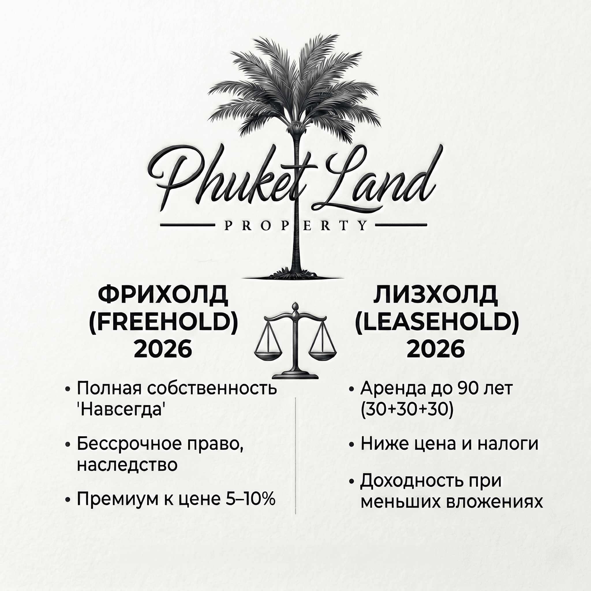 При покупке недвижимости на Пхукете один из первых вопросов, с которым сталкивается инвестор, касается формы владения. В Таиланде существует две основные квоты: Freehold и Leasehold. Понимание разницы между ними критически важно для защиты ваших активов и понимания будущей ликвидности объекта. Фрихолд (Freehold) — это форма полной собственности. В рамках иностранной квоты (Foreign Freehold) нерезиденты могут владеть до 49% общей жилой площади в кондоминиуме. Это право бессрочно: вы можете передавать объект по наследству, продавать или дарить его без ограничений со стороны застройщика. В 2026 году объекты во фрихолде остаются наиболее востребованными, так как психологически владение «навсегда» дает инвестору чувство максимальной безопасности. Однако за такое право часто приходится доплачивать сверху 5–10% от стоимости лота. Лизхолд (Leasehold) — это долгосрочная аренда, которая обычно оформляется на срок 30 лет с двумя гарантированными продлениями, что в сумме дает 90 лет владения. Юридически это контрактное право пользования. Главное преимущество лизхолда — цена. Такие объекты стоят дешевле, а налоги при регистрации сделки ниже (1.1% против 6.3% при полной собственности). Для тех, кто рассматривает инвестицию на горизонте 15–20 лет с последующим выходом из актива, лизхолд может быть финансово более выгодным за счет меньшего порога входа. Важный нюанс 2026 года: при выборе лизхолда мы настоятельно рекомендуем проверять репутацию застройщика и условия договора в части переуступки прав. Хороший контракт должен позволять вам легко продать объект третьему лицу с полным перезапуском срока аренды для нового владельца. Выбор зависит от ваших целей. Если вы ищете «родовое гнездо» или актив для максимально долгой капитализации — выбирайте фрихолд. Если же ваша цель — максимальный арендный доход на вложенный капитал, лизхолд позволит получить ту же доходность при меньших затратах.