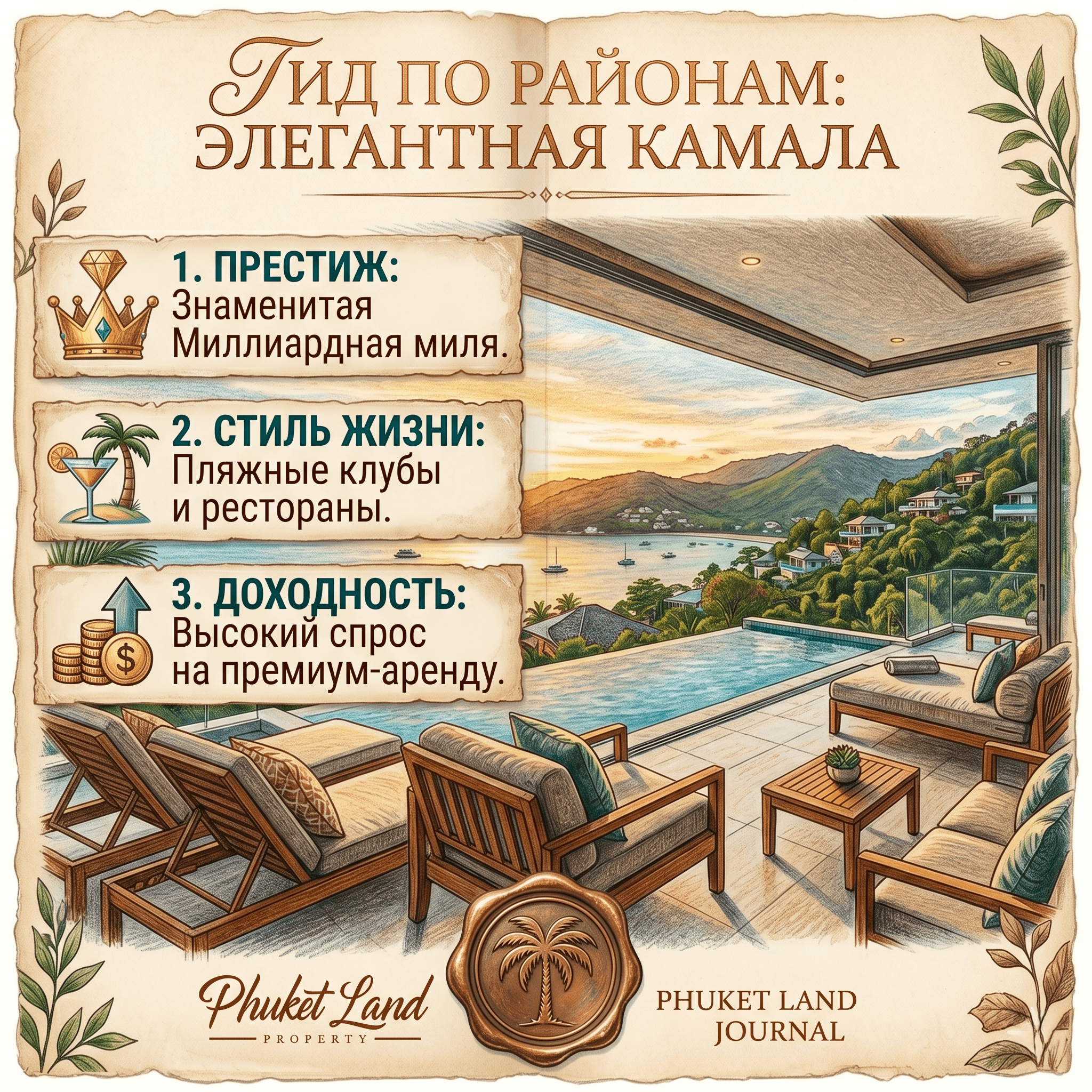 Камала — это район контрастов, который сумел сохранить атмосферу спокойной рыбацкой деревни, став при этом домом для знаменитой Миллиардной мили. В 2026 году Камала уверенно занимает позиции одного из самых престижных направлений для инвестиций и жизни на Пхукете, предлагая уникальное сочетание приватности и доступа к премиальной инфраструктуре. Миля миллиардеров Это северная часть бухты, где расположены самые дорогие и эксклюзивные виллы острова. Владение недвижимостью в этой локации — это не только вопрос комфорта, но и определенный статус. Для инвестора это означает крайне ограниченное предложение и стабильно высокий спрос на покупку среди ультра-хайнетов со всего мира. Даже в периоды рыночных колебаний объекты в этой зоне демонстрируют завидную устойчивость в цене. Инфраструктура и стиль жизни Центральная часть Камалы за последние годы трансформировалась в центр качественного досуга. Пляжные клубы мирового уровня, такие как Cafe del Mar, и изысканные рестораны на побережье делают район привлекательным для активной и обеспеченной аудитории. При этом южная часть бухты остается тихой и подходящей для семейного отдыха, что расширяет возможности для сдачи жилья в аренду разным категориям туристов. Инвестиционная привлекательность В 2026 году в Камале завершается строительство нескольких знаковых проектов от мировых отельных брендов. Покупка недвижимости в таких комплексах позволяет инвесторам рассчитывать на профессиональное управление и доходность выше среднерыночной за счет силы бренда. Кроме того, Камала находится в удобной транспортной доступности: всего 15 минут до оживленного Патонга и столько же до респектабельного Бангтао, что делает её идеальной «золотой серединой». Выбирая Камалу, вы инвестируете в район, который уже перерос стадию бурного освоения и вошел в фазу зрелого, качественного роста. Это локация для тех, кто ценит эстетику, тишину и долгосрочную финансовую стабильность.